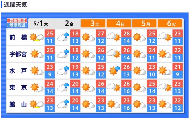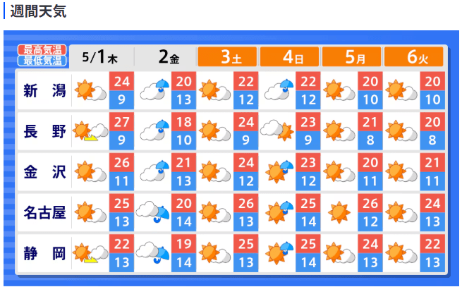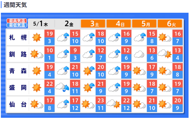 GW後半4連休のお天気は 日本列島全国各地の主要都市のゴールデンウィーク週間天気予報 画像でわかりやすく テレビユー山形 2025年4月29日(火) 14:01 国内 ゴールデンウィークにお出かけする人は、お天気が気になりますよね。全国のGW期間中の気象情報を画像でお伝えします。(5月1日~6日まで) 北海道・東北 関東 東海・北陸・甲信
