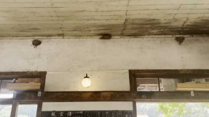ホームを出て駅舎の中に入ると、2羽のツバメが飛び交っていた。見上げると、燕が巣を作っていて、愛を育くんでいた。