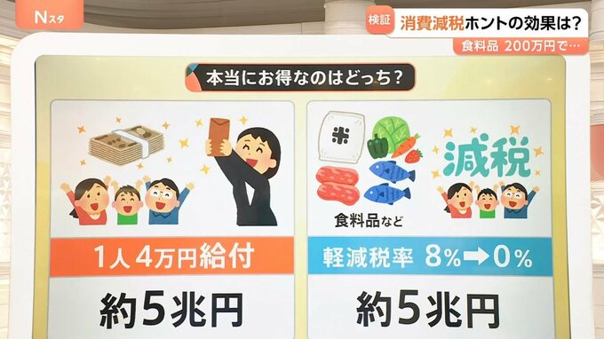 1人4万円給付には約5兆円の財源が必要となってきます。そして、軽減税率を8%から0%にすると、財源は4万円給付と同じ約5兆円です。
