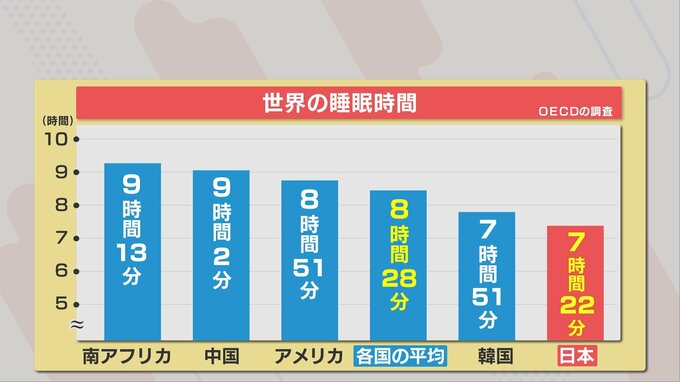 OECD(経済協力開発機構)が33か国を対象に調査した1回の睡眠時間は、南アフリカ「9時間13分」アメリカ「8時間51分」で、日本は「7時間22分」と最下位です。全体の平均よりも日本は1時間以上も短いことが報告されています。