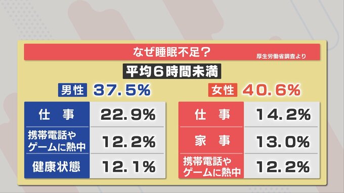 実際に、厚生労働省の調査でも、平均睡眠時間が6時間未満の人は、男性が37.5%、女性が40.6%と、4割ほどを占めています。