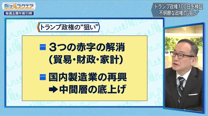 「“2つの狙いを一挙に解決できるのが関税”だというが、どれも簡単に解決できる話ではない。関税がどう落ち着くかわからず【貿易赤字】がどれだけ解消するのかは大きなクエスチョン。【国内製造業の再興】はトランプ政権1代でできる話ではないし、そもそもアメリカ人が付加価値の高いものを製造業として工場で作ることに今向いてるのかどうなのか」