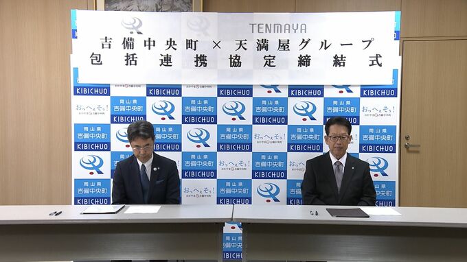 締結式は、吉備中央町役場で行われ、山本雅則町長と天満屋の斎藤和好社長が協定書を交わしました。天満屋グループは2023年から各地の自治体と協定を結んでいて、県内では吉備中央町が14例目になります。