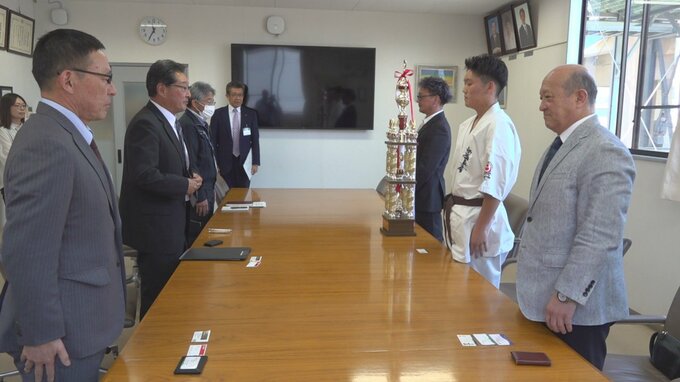 直接打撃制となるフルコンタクト空手の全国大会で準優勝に輝いた北杜市の高校生が市長に結果を報告しました。