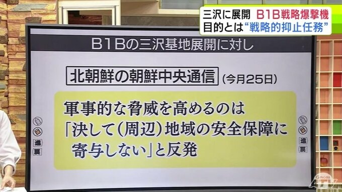 B1B戦略爆撃機の配備に対し、北朝鮮の朝鮮中央通信は4月25日、B1Bが三沢基地に長期配備される可能性を指摘し、軍事的な脅威を高めるのは「決して地域の安全保障に寄与しない」と反発しました。