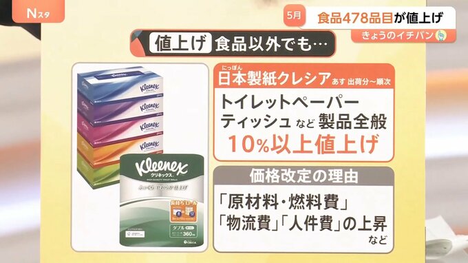 日本製紙クレシアでは、5月1日の出荷分から「クリネックス」「スコッティ」などのブランドで展開しているトイレットペーパーやティッシュなど製品全般を10%以上値上げするということです。