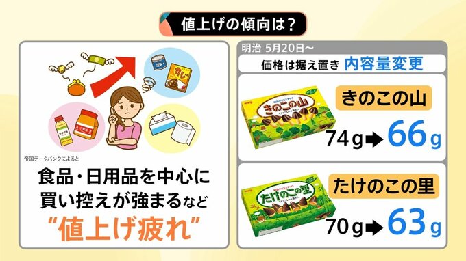 値上げの傾向としては、食品・日用品を中心に買い控えが強まるなど、消費者の“値上げ疲れ”が顕著に出始めているということです。