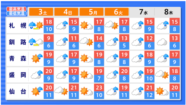 GW後半に突入!全国のお天気を見てみよう 日本各地の主要都市を掲載(北海道・東北・関東・東海・北陸・甲信・近畿・中国・四国・九州・沖縄) テレビユー山形 2025年5月1日(木) 09:44 国内 ゴールデンウィークも後半に入りました。全国各地の主要都市のお天気を地域別に掲載します。参考にしてください。 北海道・東北