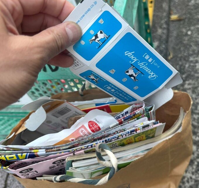 滝沢さんは、雑誌やチラシなどが束にされ詰め込まれた紙袋の中から、石けんの空き箱がたたまれたものを取り上げた写真を投稿。「石鹸の箱は可燃ごみで大丈夫です。」と知らせています。