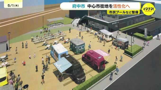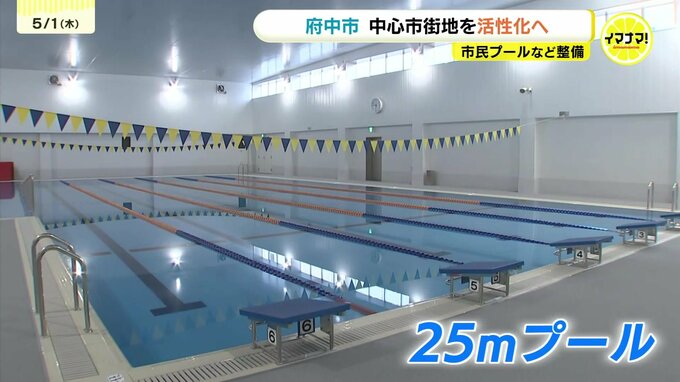 「府中市は中心市街地の活性化に取り組んでいます。この夏にオープンする市民プールが完成し、新たなにぎわいが期待されています」