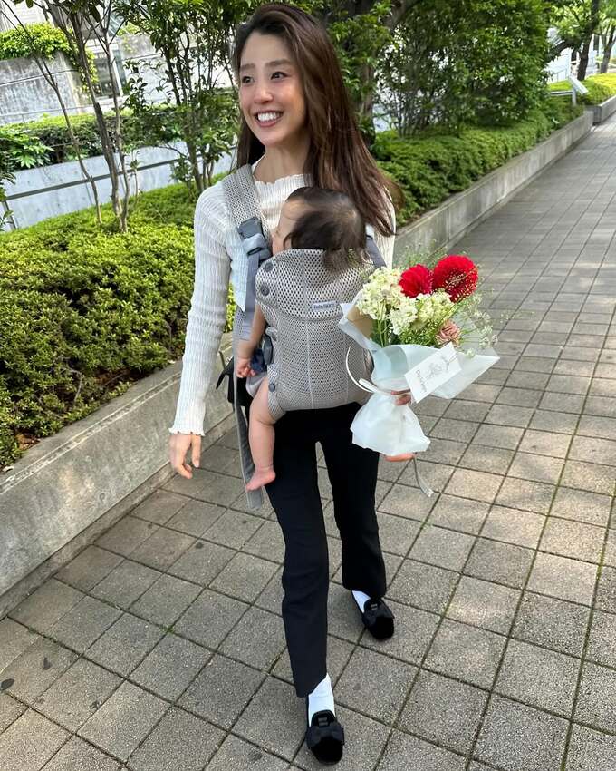 岡副さんは「親友の子どもの発表会に行った日」として、緑溢れる遊歩道を、娘を前抱きにしつつ花束も抱えて笑顔で散歩。