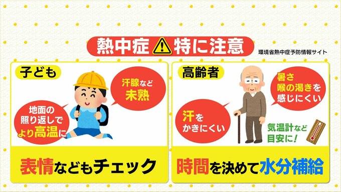 子どもの表情をよく見て、苦しそうにしていないかチェックしたり、高齢者の方は時間を決めて、喉が渇いていなくても適宜水分補給をするなど、熱中症にならないよう注意する必要があります。