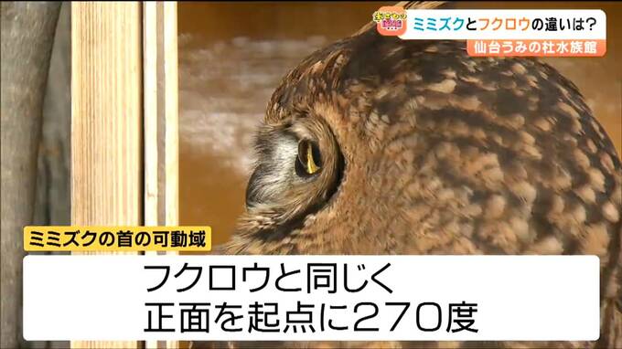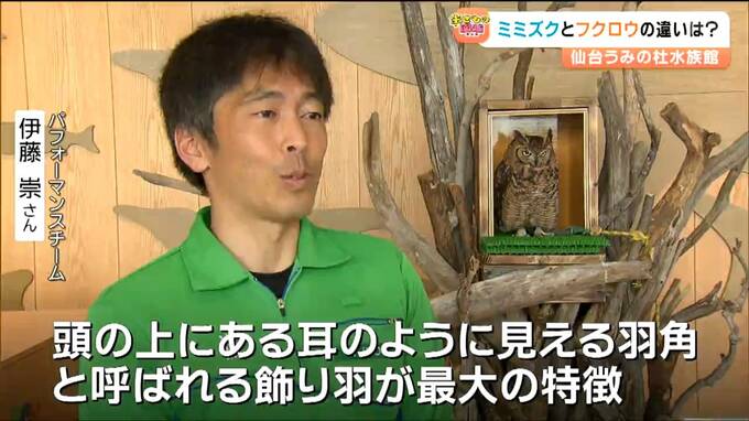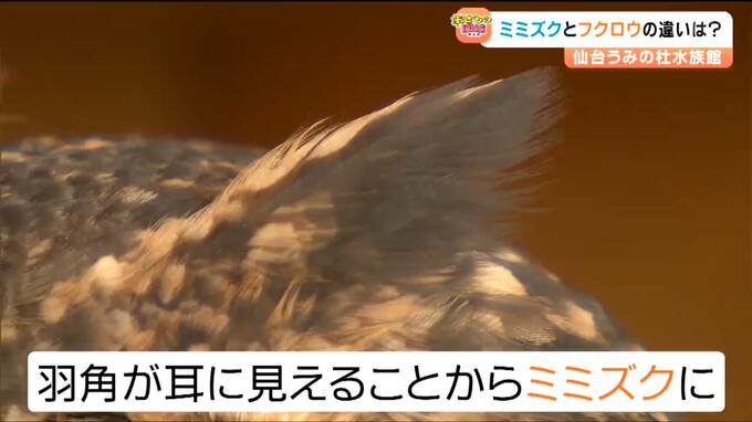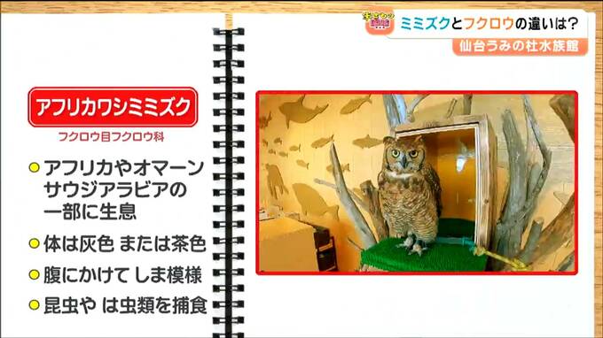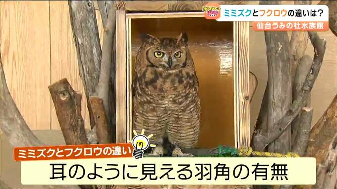 「仙台うみの杜水族館」の生きものたちを紹介するシリーズ。今回は猛禽類でフクロウの仲間、ミミズクです。水族館では、3月下旬から展示が始まりましたが、みなさん、ミミズクとフクロウの違いご存じですか?