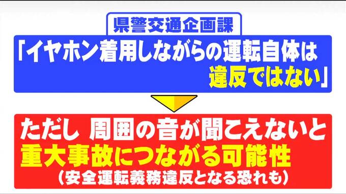 県警交通企画課によると、イヤホンを着用しながらの運転自体は「違反ではない」ということです。ですが、イヤホンで音楽を聞くなどして周囲の音が聞こえない状況での運転となると重大な事故につながる可能性もあります。安全運転義務違反となる恐れもあるので警察も運転に集中してほしいと呼びかけています。