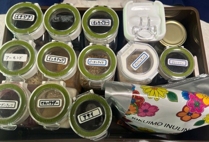 その「スーパーフーズ」について「こんなに種類があるので」「旅には少しづつラップにくるんで持参」と、トレイにぎっしりと並べたスーパ-フーズの写真を投稿。ナッツやドライベリー、パウダーなどが各々数種類ずつジャーに入れて並べられていて、壮観そのものです。