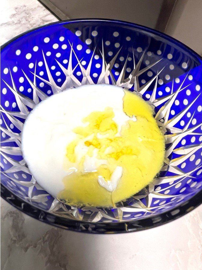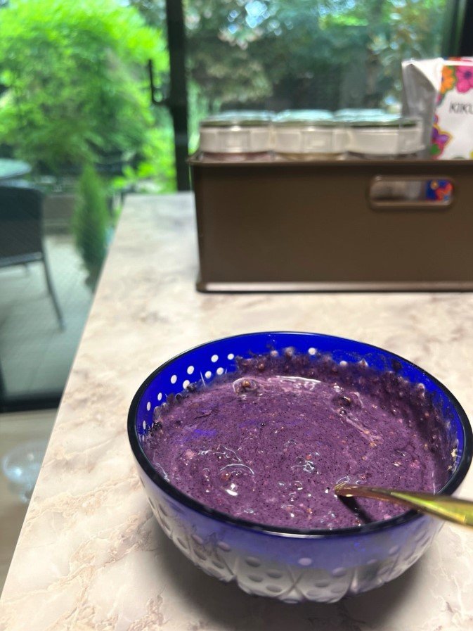 さらに藤さんは、オイルを「スプーン1杯くらい」そして「いつものスーパーフーズも入れて混ぜたら」「こんなパープルカラーに」と、深い紫色に染まったヨーグルトの写真を投稿。