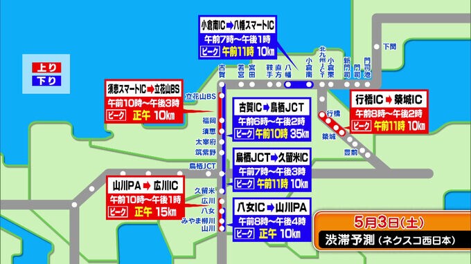 暦の上では3日から4連休、ゴールデンウィークも後半となります。高速道路の混雑は3日がピークと見込まれていて、九州道の下りでは最大35キロの渋滞が予想されています。ネクスコ西日本によりますと3日は九州…