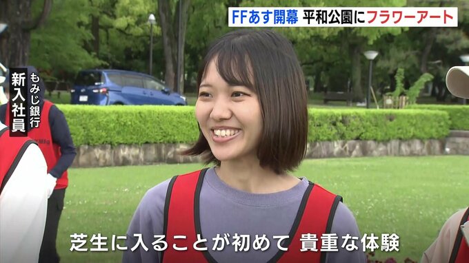 原爆慰霊碑前の芝生では、もみじ銀行の新入社員などが、花々を丁寧に並べていました。