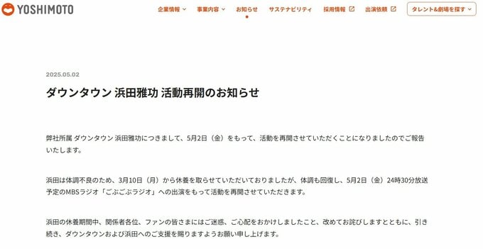浜田は体調不良のため、3月10日(月)から休養を取らせていただいておりましたが、体調も回復し、5月2日(金)24時30分放送予定のMBSラジオ「ごぶごぶラジオ」への出演をもって活動を再開させていただきます。