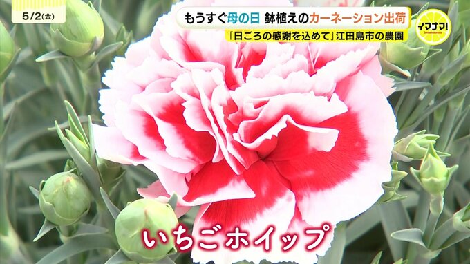 5月11日の「母の日」を前に、広島県江田島市の農園で、鉢植えのカーネーションの出荷が最盛期を迎えています。ことしは、冬場の寒さで開花が5日ほど遅れましたが、母の日に間に合わせることができました。