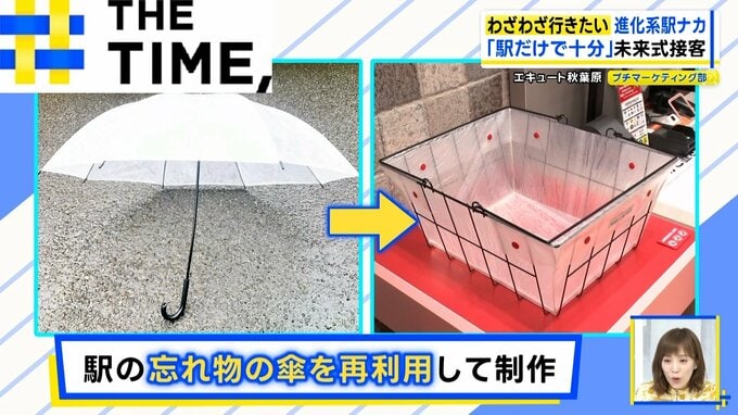 さらに【買い物カゴ】は、駅の“忘れ物のビニール傘をリサイクル”して制作。