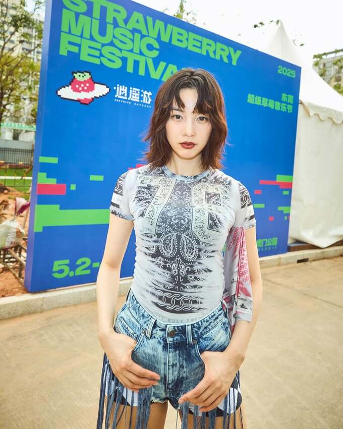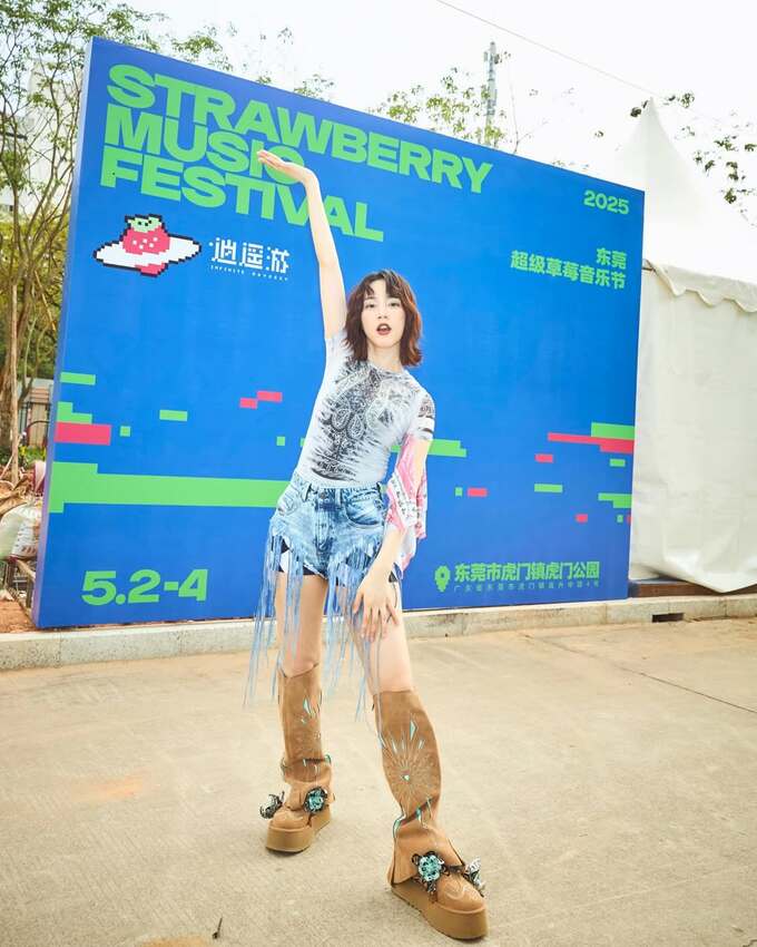 さらに続く投稿では、会場のパネルを前に、フェス衣装でポーズ。透けっぽくペイズリーがプリントされたTシャツにデニムのショーツと膝までの厚底ウェスタンブーツで合わせていて、アジアやアメリカのトライバルさが暑そうな会場にマッチしています。