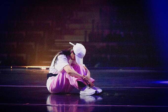 浜崎さんは、白のキャップとTシャツに、ピンクのパンツと白のスニーカーという、ダンスに備えたような衣装を纏いつつも、暗いステージの上で膝を抱えてうつむいて座り込んでいる自身の姿を投稿。