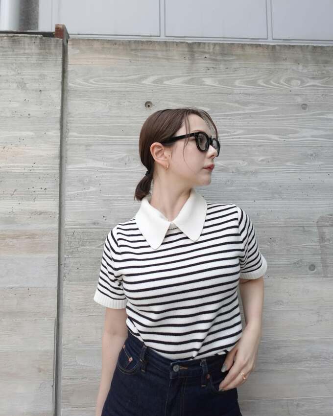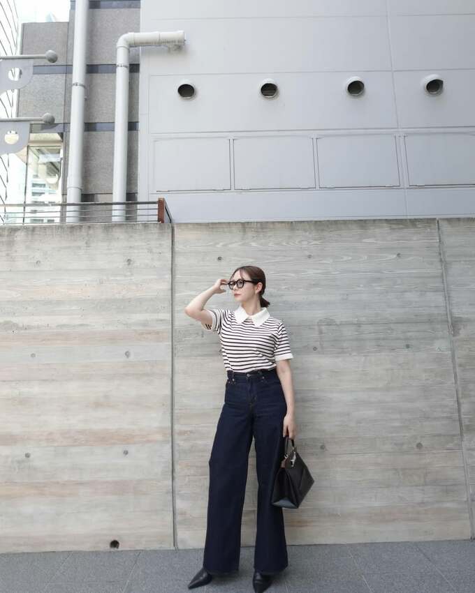 村重さんは、裾がフレアっぽく広がるデニムのパンツに襟付きボーダーの半袖トップスを合わせ、髪を後ろにまとめて「ユニクロの小顔伊達メガネ」を装着。パンツについては「足の長さ5センチ盛り」と説明していて、小物や服のデザインを生かして少しでもスタイルを良く見せる “盛り” の技を披露。