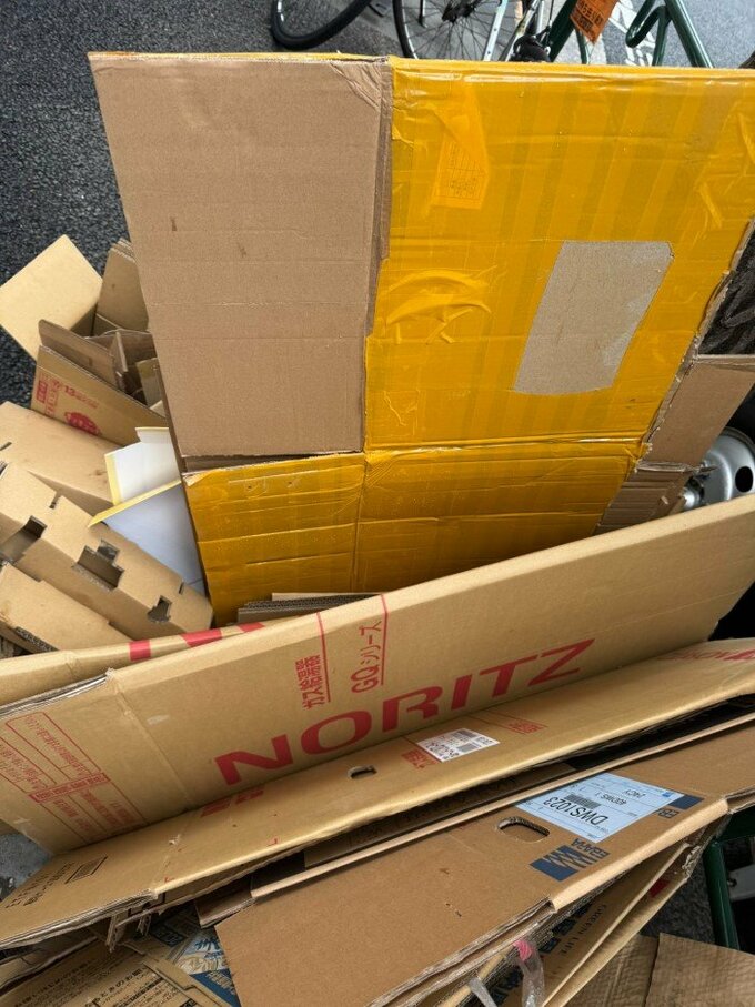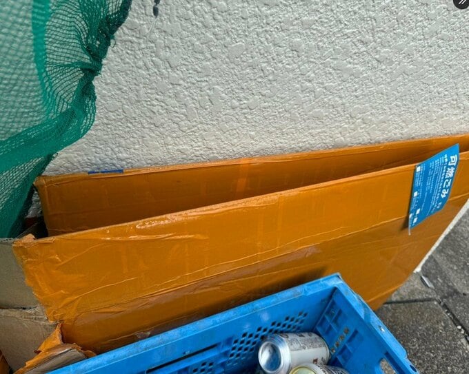 滝沢さんは「ビニールテープぐるぐる巻きのダンボール」について写真を投稿。「ここまで貼っているものなら、可燃ごみ」と、ダンボールのほぼ全面にテープがびっしりと貼られたものは “古紙回収でなく可燃ゴミ” と伝えています。