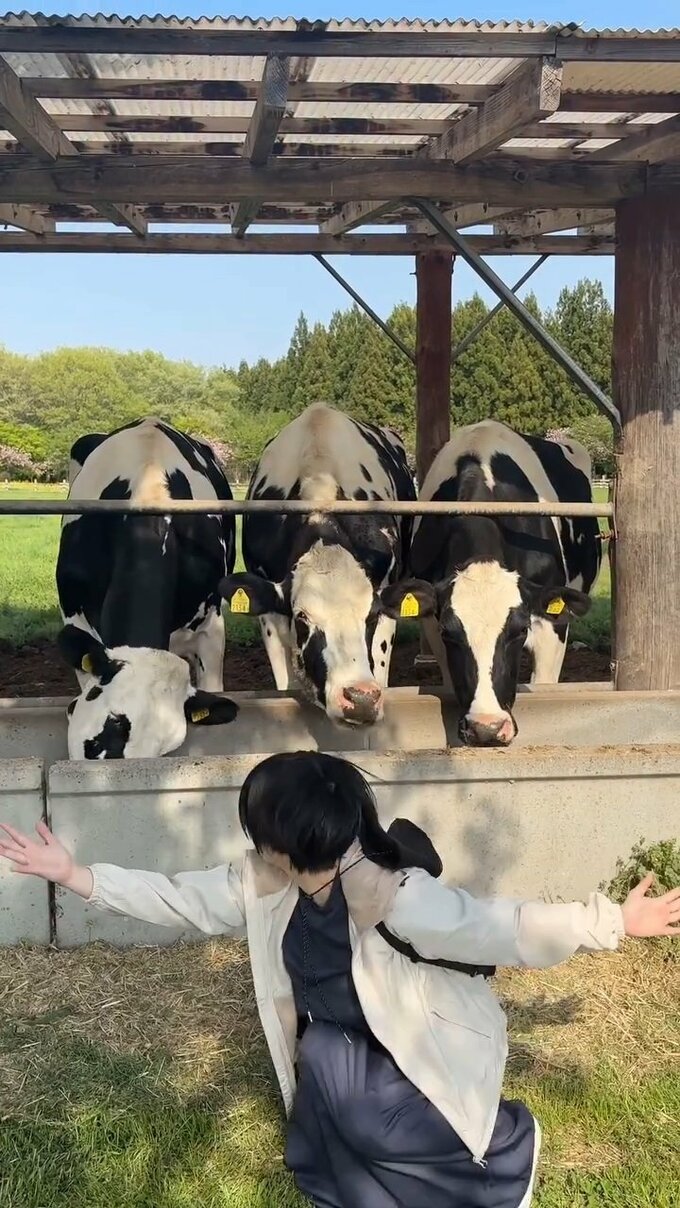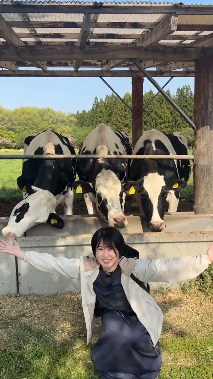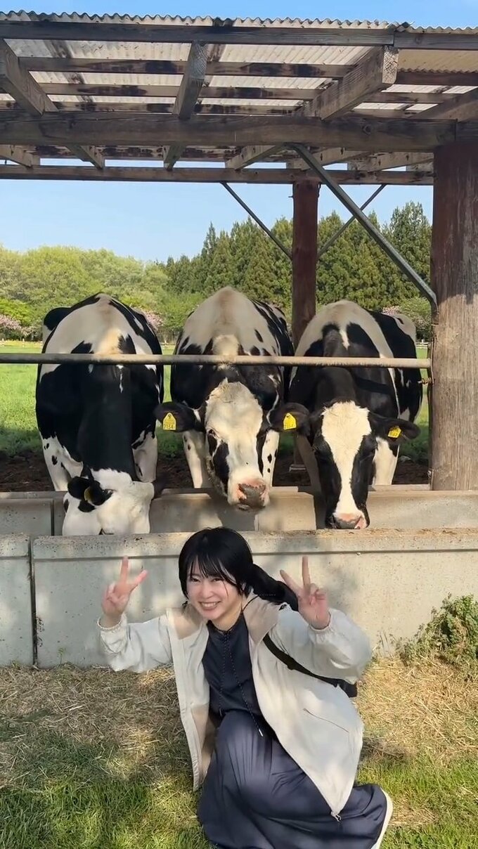 志田さんは、白黒のまだら模様の牛たちがいる牧場の一角で、身を寄せ合ってモグモグと一心に餌を食べる牛たちをバックに満面の笑顔でピースサイン。「牛とも仲良くなった」とテキストしています。