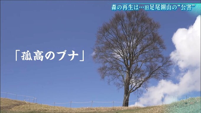 資源の採掘がもたらした傷跡。それに抗うかのように立つ1本のブナ。ここ足尾は、森と私たち人間の関係を今、改めて問いかけています。