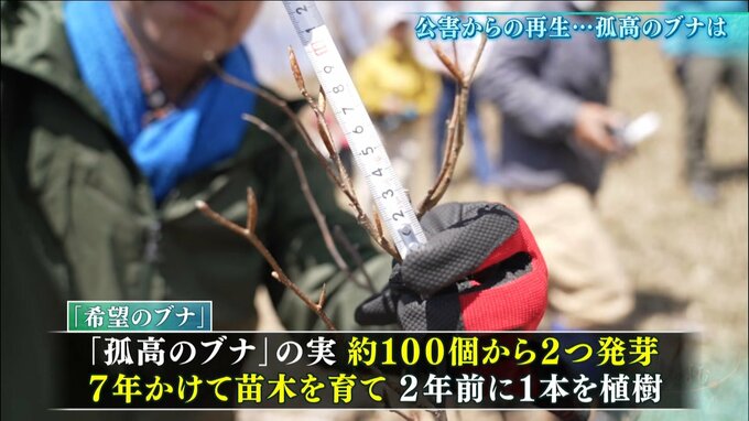 さらに「孤高のブナ」の種子から、新たなブナを育てる取り組みも。約100個ほどの実から発芽したのはわずか2つ。7年かけて苗木に育て、そのうちの1つを「希望のブナ」と名付け、ようやく2年前に植えることができました。