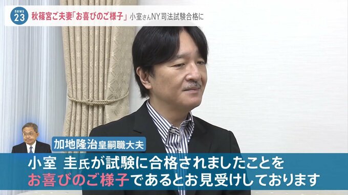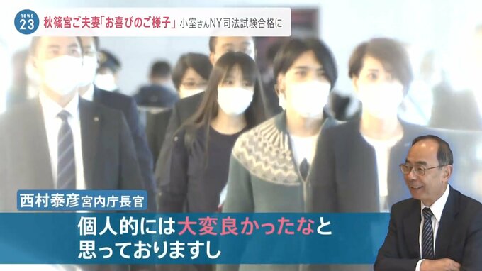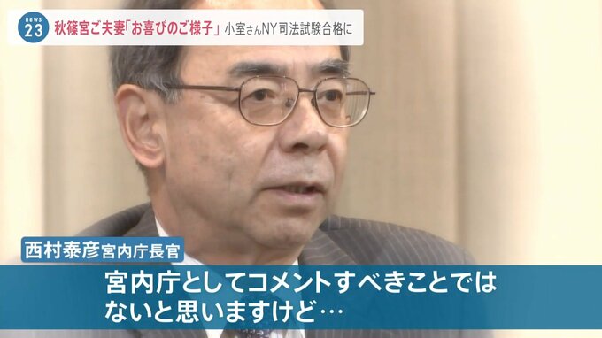 また個人の受け止めとした上で「小室圭氏が努力されて今回合格ということでお祝いの気持ちを持っております」とコメントしました。