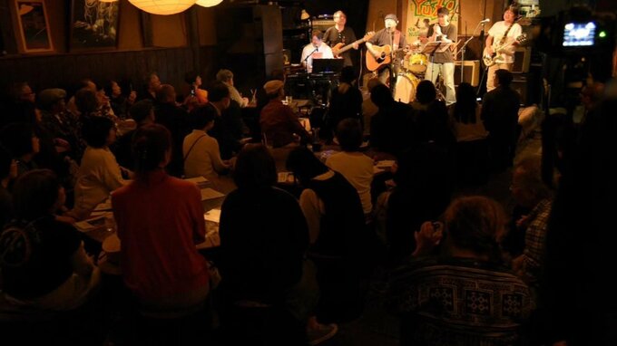 4月26日に京都市上京区の「拾得(じっとく)」のステージに立ったのは、釜石市の「クロコダイルティアーズ」の6人です。「関西フォークの草分け」といわれる豊田勇造さんのライブに特別ゲストとして招かれる形で、7曲を披露しました。