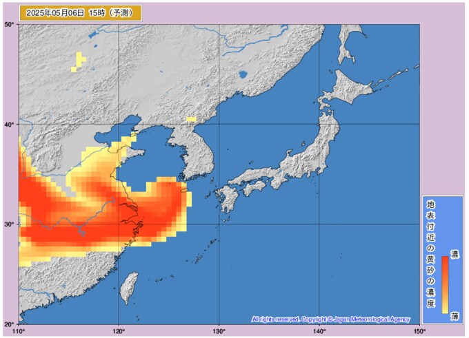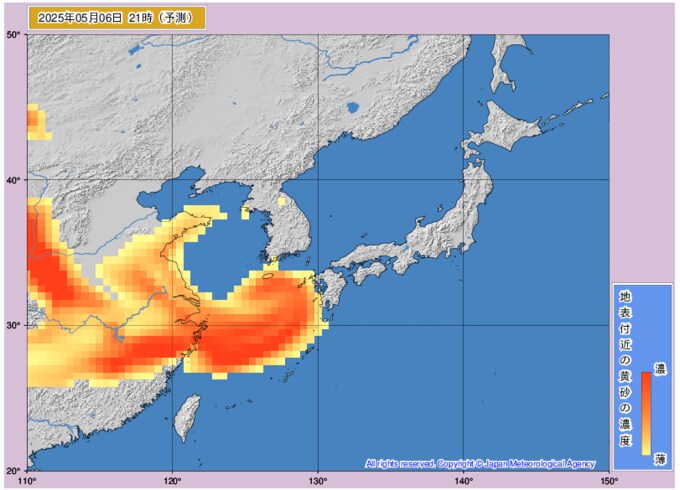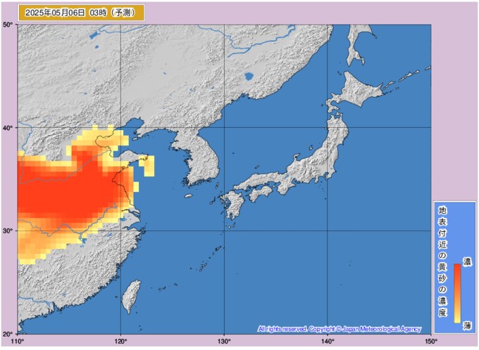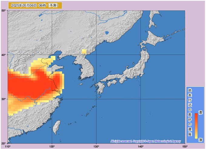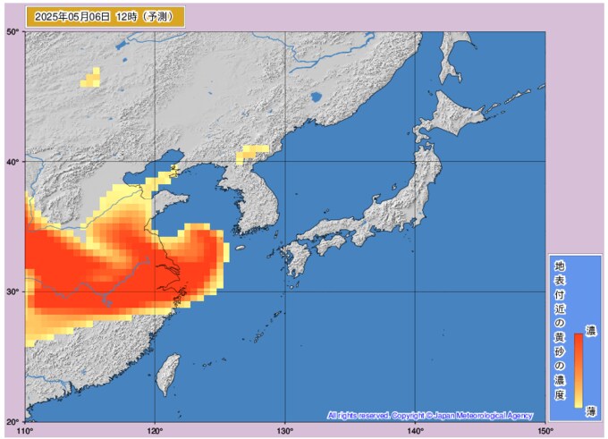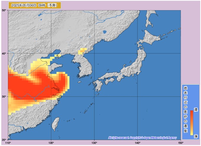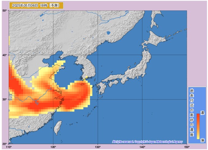 黄砂情報 7日~8日にかけて日本に黄砂が どこにどのくらい黄砂が飛来するかを画像シミュレーション 近畿・中国・四国・九州地方など広く西日本に影響か 気象庁発表 テレビユー山形 2025年5月5日(月) 10:26 国内 ■6日