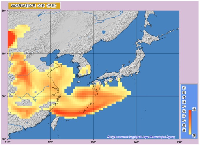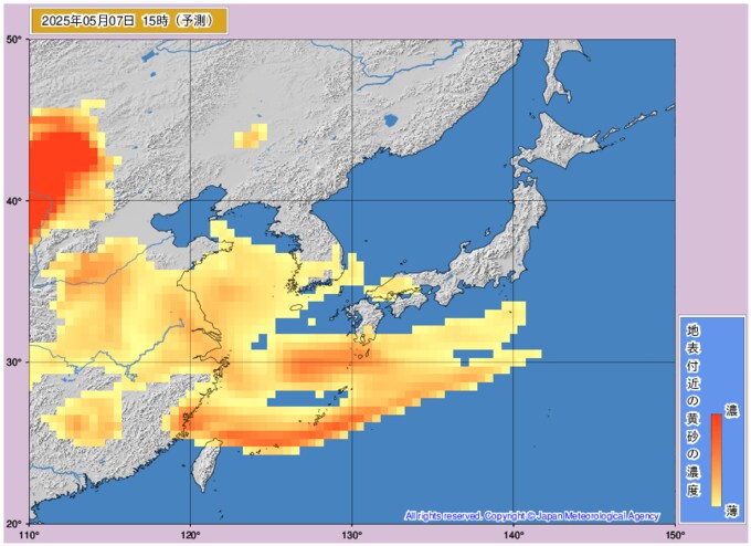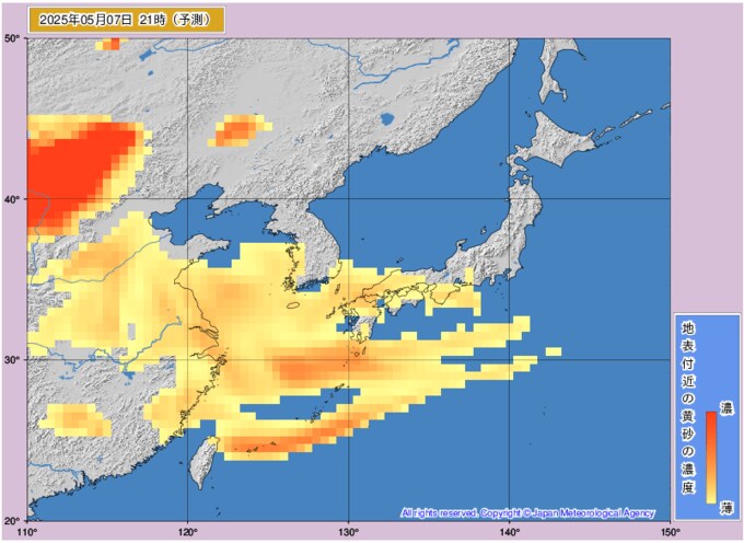 黄砂情報 7日~8日にかけて日本に黄砂が どこにどのくらい黄砂が飛来するかを画像シミュレーション 近畿・中国・四国・九州地方など広く西日本に影響か 気象庁発表 テレビユー山形 2025年5月5日(月) 10:26 国内 ■7日