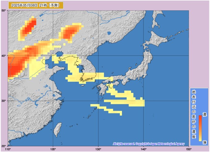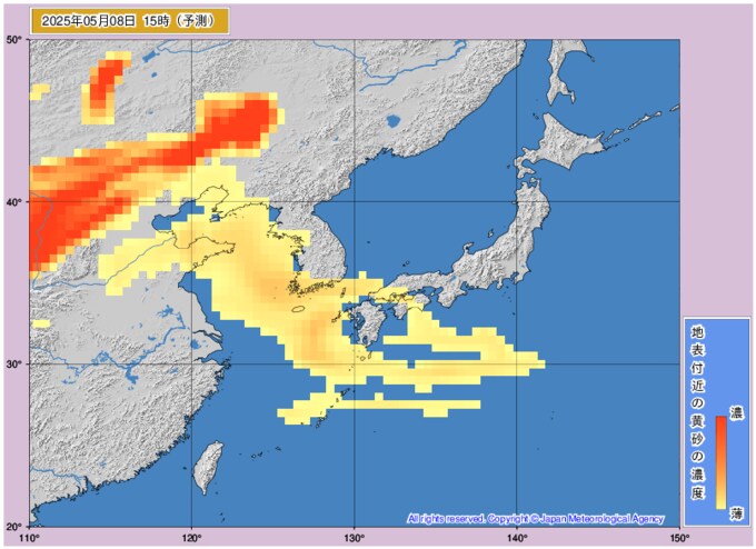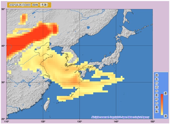 黄砂情報 7日~8日にかけて日本に黄砂が どこにどのくらい黄砂が飛来するかを画像シミュレーション 近畿・中国・四国・九州地方など広く西日本に影響か 気象庁発表 テレビユー山形 2025年5月5日(月) 10:26 国内 ■8日