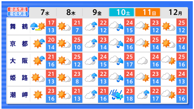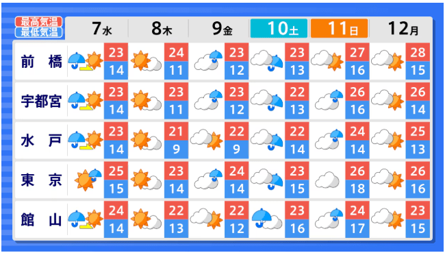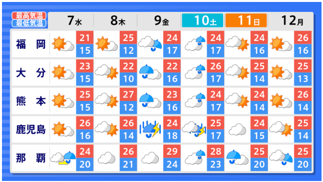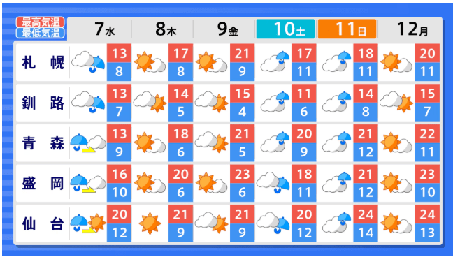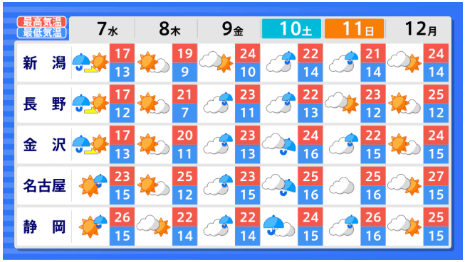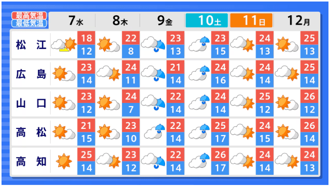 今後の全国のお天気は 全国各地・主要都市の週間天気予報をチェック(北海道・東北・関東・東海・北陸・甲信・近畿・中国・四国・九州・沖縄) テレビユー山形 2025年5月5日(月) 11:13 国内 ゴールデンウィーク(GW)も終盤。全国各地の今後の週間天気を確認してください。 北海道・東北 関東 東海・北陸・甲信 近畿 中国・四国 九州