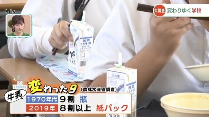 農林水産省の調査などによると、牛乳を瓶で提供する学校は1970年代には全国で9割を占めていましたが