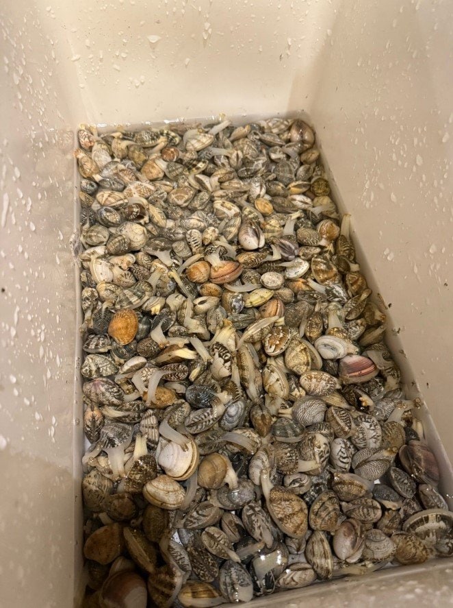 杉浦太陽さんは「しっかり獲れたね〜 獲れたアサリは砂抜き中〜」と、クーラーボックス一杯の貝の画像を投稿しています。