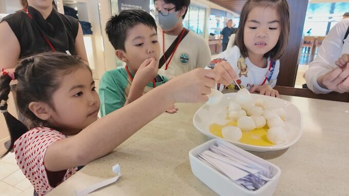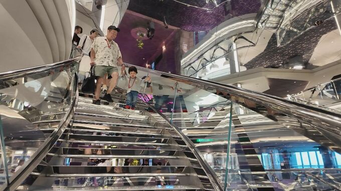 「MSCベリッシマ」は、全長315メートルあまり、高さは20階建てのビルに相当する巨大クルーズ船です。那覇への寄港にあわせて開かれた見学会には、県内在住の親子28組が参加し、広い船内を2時間かけて見学しました。