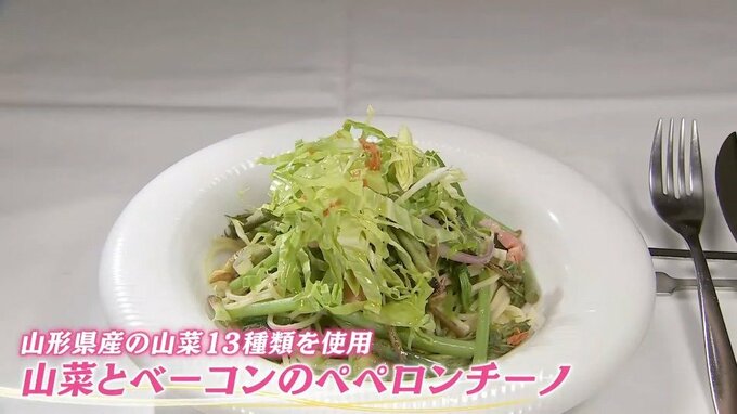 この時期のおすすめは、山形県で採れた13種類の山菜を使った「山菜とベーコンのペペロンチーノ」だそうです。そのお味は…