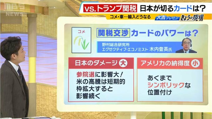 しかし、この「米」を交渉カードとして切ることの効果について、専門家は厳しい見方を示しました。野村総合研究所のエグゼクティブ・エコノミスト、木内登英氏は、日本がアメリカの要求を受け入れた場合、日本のダメージは大きい、特に大きいのは「政治的ダメージ」と指摘します。与党の支持基盤である日本の農家を刺激することになり、間近に控える参院選への影響が懸念されるためです。