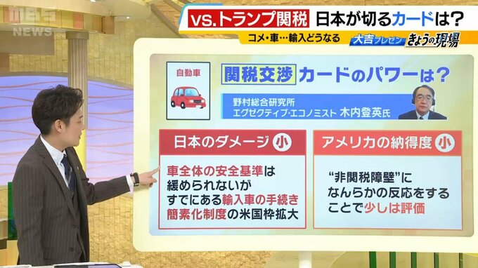 木内氏によると、車自体の安全基準は緩められないが、すでにある「輸入車の手続きの簡素化」は可能で、このカードを切った場合、日本のダメージは比較的小さいとみています。ただアメリカ側の納得度も小さいと見られています。非関税障壁に関して何らかの対応をすることで、トランプ大統領が「自分が強く言い続けたから日本が変わった」とアピールする材料にはなるかもしれませんが、経済的な効果は限定的だからです。