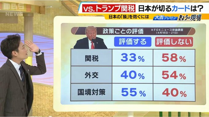 いっぽうFOXニュースがトランプ政権の政策ごとの評価を調査(4月18~21日)したところ「関税:評価する33% 評価しない58%」「外交:評価する40% 評価しない54%」「国境対策:評価する55% 評価しない40%」となっています。