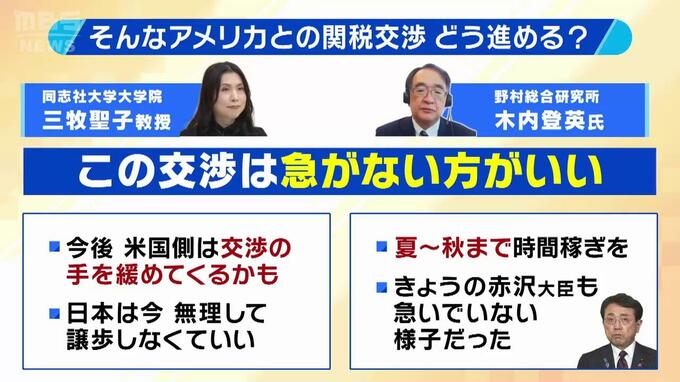 そして三牧氏、木内氏とも「この交渉は急がない方がいい」と見ています。三牧氏は、国内で批判が高まれば、アメリカ側が交渉の手を緩める可能性を指摘。野村総合研究所の木内登英氏も、アメリカ国内で関税による物価上昇への反発が強まる夏から秋頃まで「時間稼ぎ」をすべきだと提言。その時期になれば、アメリカ側が関税の見直しに動く可能性があると見ています。