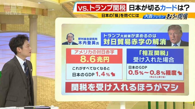 木内氏は、仮に関税を受け入れた場合の日本のGDPへの影響は【0.5~0.8%減】で、アメリカの要求通りに対日赤字8.6兆円が全て解消された場合は【GDP1.4%減】となるため、「結果、関税を受け入れる方がマシ」との見方も示しており、今後の交渉の行方が注目されます。