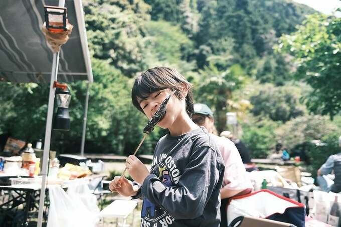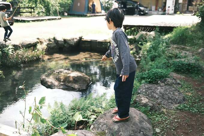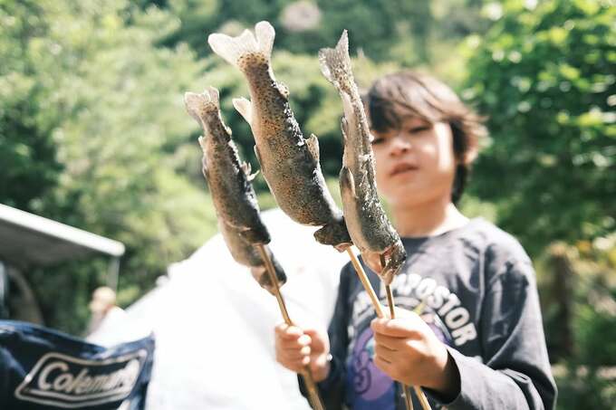 投稿された画像では、子どもが釣りを楽しむ様子や、焼いたマスを食べる姿、テントが設営された様子などが見て取れます。