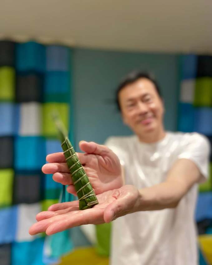 遠藤さんは、左の掌に笹の葉で包まれ弦で縛られた「粽」を立て、右手で支えて差し出すように写真に収まり「ちまきです。どうぞ」とテキストを入れつつ、写真の奥で微笑んでいます。