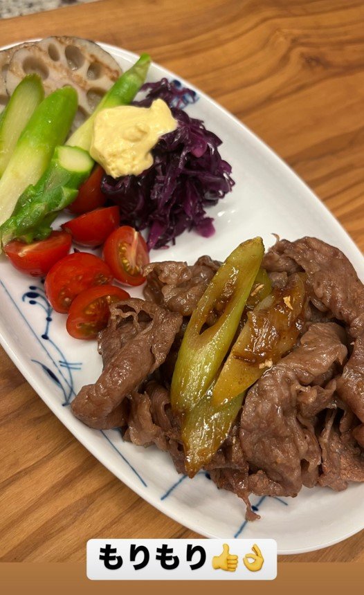 工藤静香さんは「もりもり」と綴ると、肉料理・トマト・アスパラガス・蓮根などが盛り付けられた、手料理の画像をストーリーにアップ。